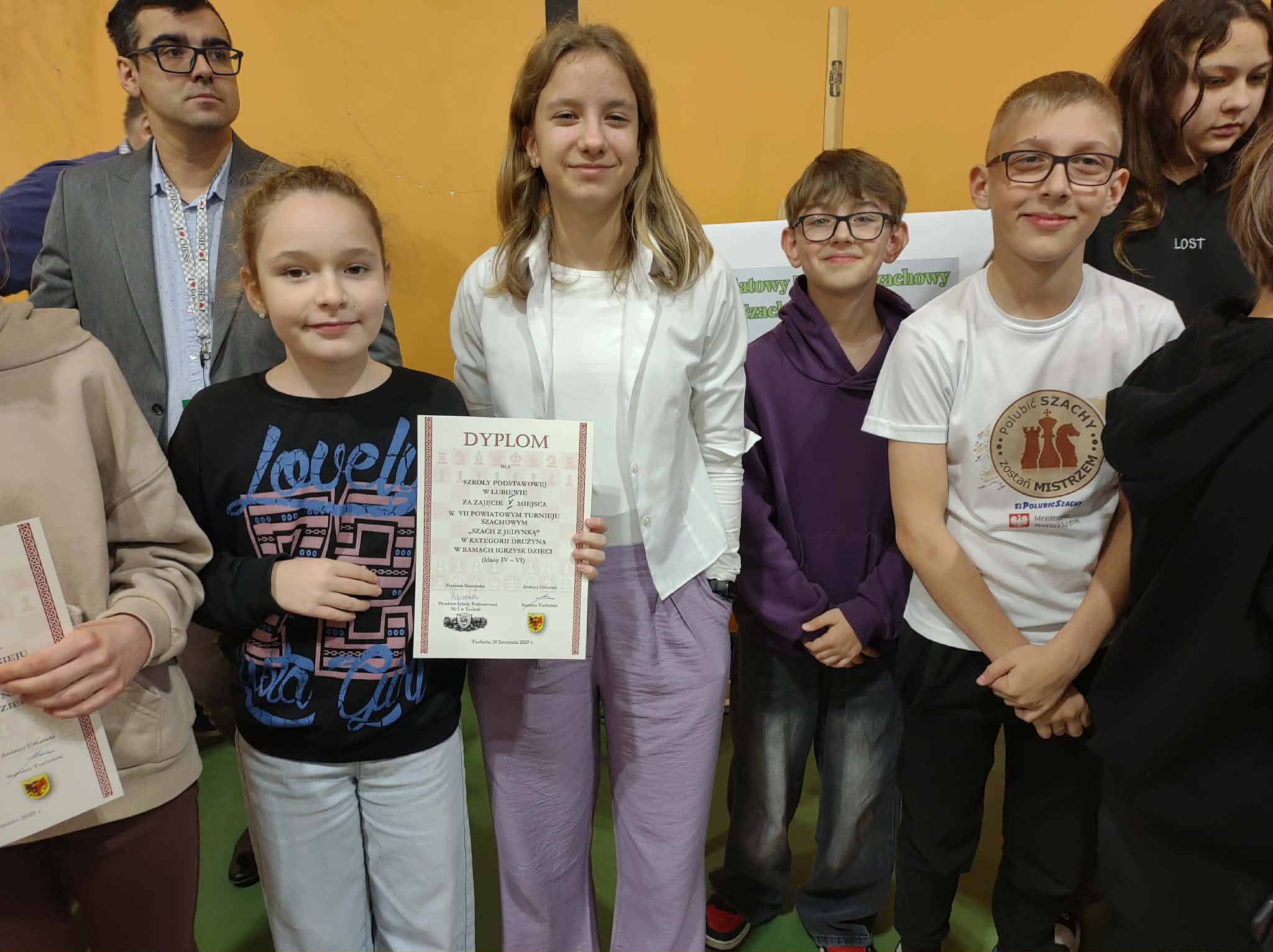 Najlepszy wynik dla naszej szkoły wywalczyli uczniowie klas 7-8. Mirosław Anguelov, Antoni Nowacki, Tadeusz Regent oraz Julia Socha, którzy po solidnej walce zajęli 3 miejsce. Partia za partią udowadniali, że strategia i stalowe nerwy nie są domeną tylko dorosłych. Tuż za podium uplasowała się drużyna klas 1-3, która zajęła 4 miejsce w składzie: Antoni Gontarz, Stasiu Iwicki, Nikodem Kołakowski oraz Zuzanna Zielazna. Młodzi szachiści pokazali, że dopiero zaczynają rozkręcać się w tej królewskiej pasji – a potencjał mają niemały.